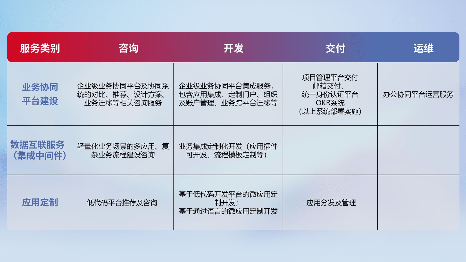 针对钉钉、、企微、、IDaas等平台级产品提供产品的规划、、、方案、、、交付、、定制化开发等服务,,实现如统一协同办公、、、、智能客户服务、、、、混合会议管理、、智能数据查询、、、等业务场景,,实现数字化转型。。。。